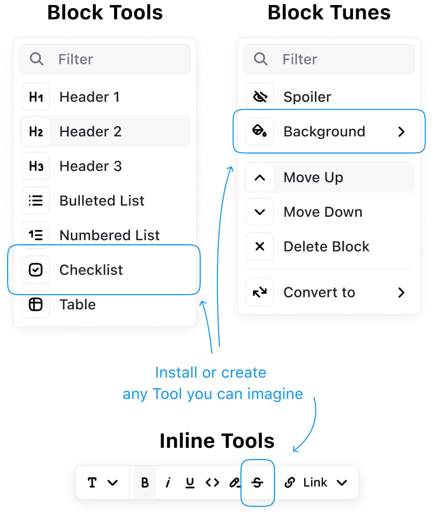 "Designed to be extendable and pluggable with a <a href="https://editorjs.io/creating-a-block-tool">simple API</a>",